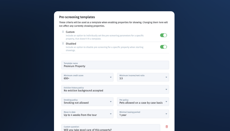 Remember you can pre-configure all of this criteria in templates from our Settings > Showings menu. Setting up templates makes it quick and easy to start showing a property - just select the pre-screening template during the activation flow and you’re on your way!